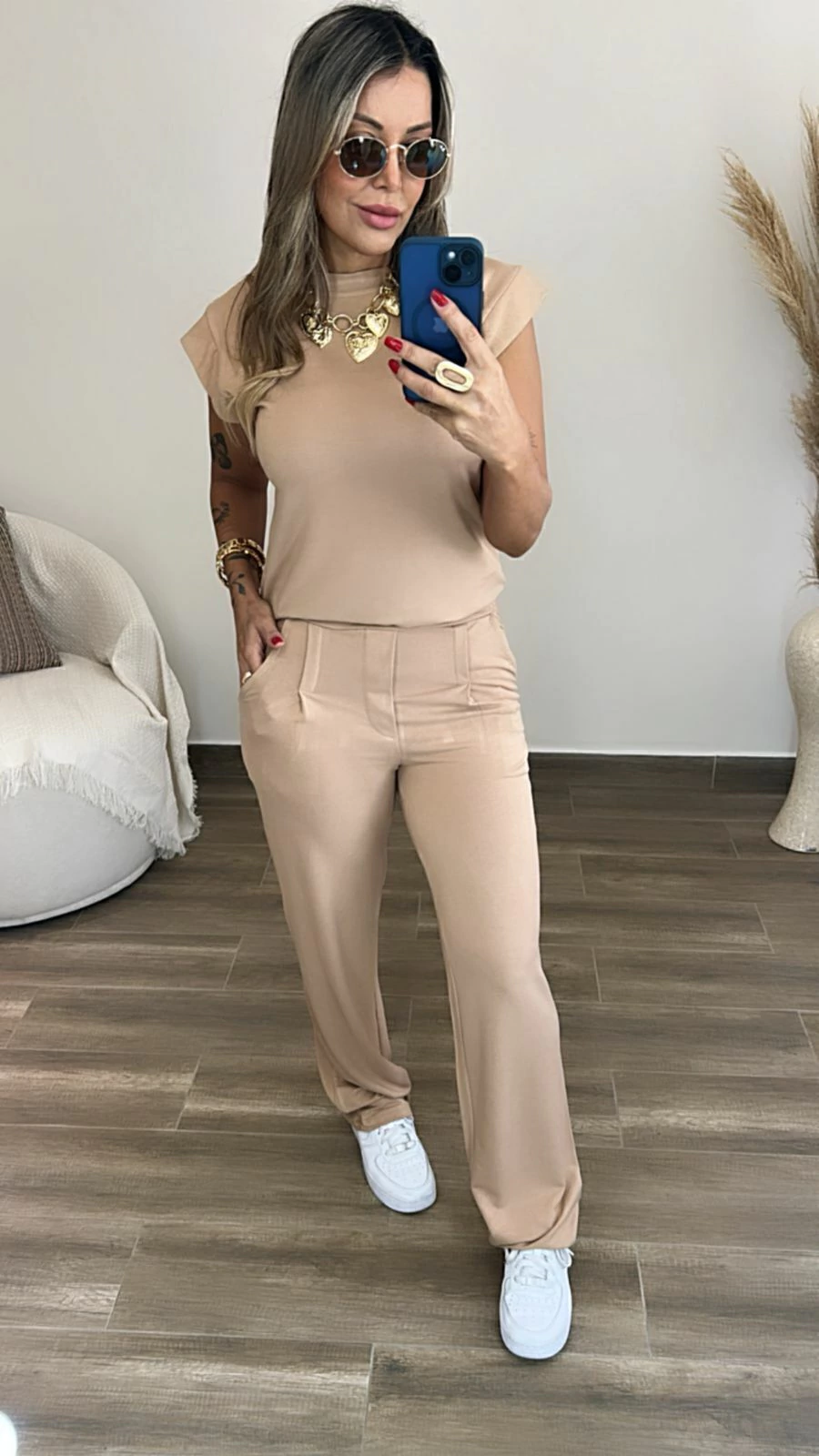 A blusa alongada destaca-se pelas fendas laterais, que proporcionam um toque moderno e sofisticado, enquanto a calça com corte alfaiataria valoriza a silhueta com um ajuste perfeito, ideal para diversas ocasiões, do casual ao mais arrumado.